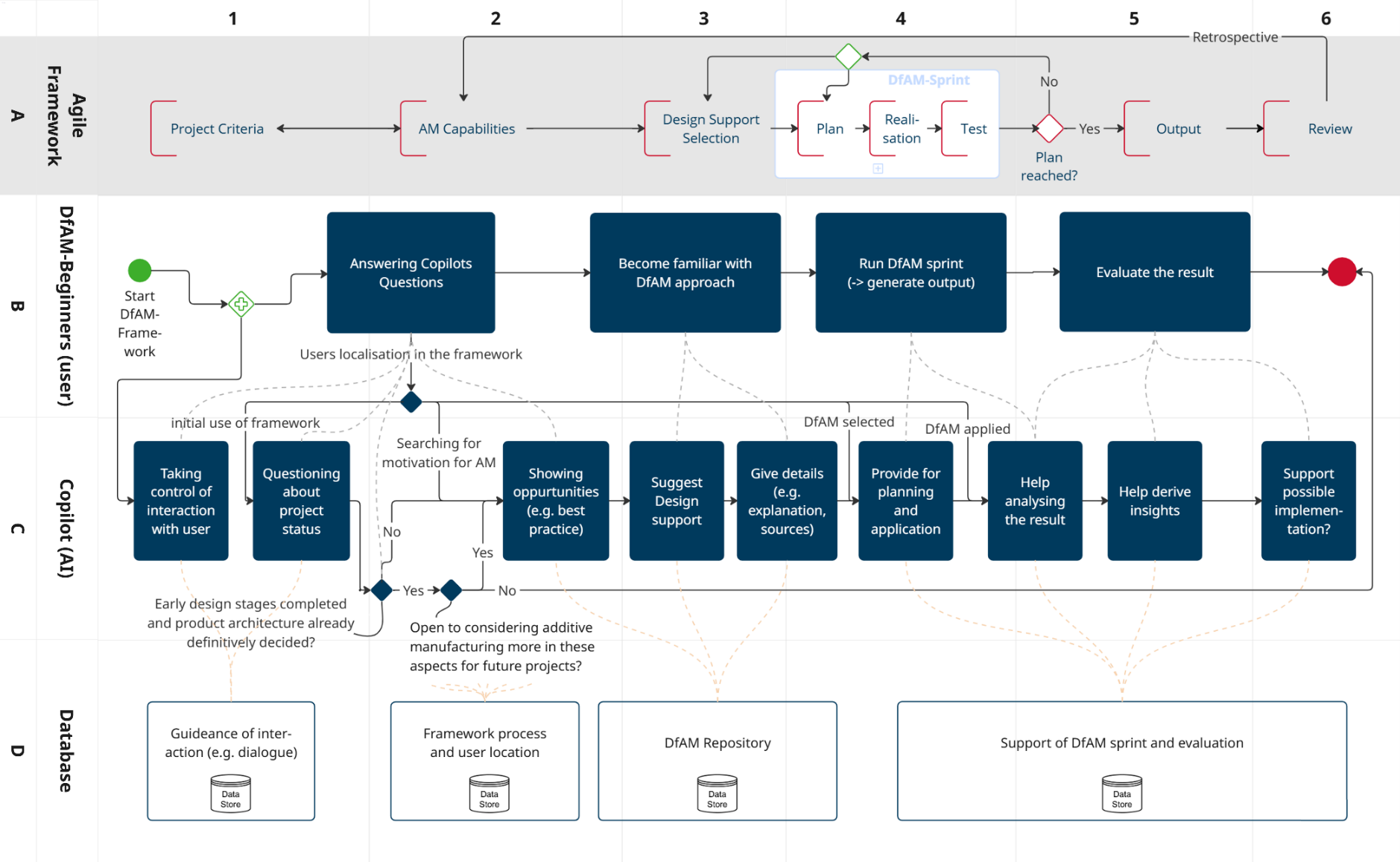 The structure of the framework is based on an approach that is inspired by an agile framework called scrum You can find further information about it in this paper. If you are interested in learning more about the development of the framework, you can read about its creation another publications (coming soon). The BPMN diagram below shows the framework of the the basic structure process. The four lanes (a-d) represent the main elements / actors.